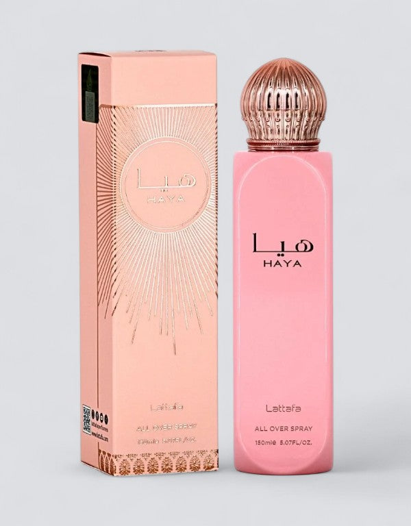 Haya All Over Spray by Lattafa bursts open with a dazzling cocktail of pink champagne, pink berries, and blood orange, offering a sparkling and effervescent start. Mandarin and pink freesia add a citrusy brightness and delicate floral touch, making the opening feel both playful and luxurious. In the heart, an elegant bouquet of gardenia, vanilla orchid, and jasmine brings a creamy floral richness that adds sensuality and sophistication.