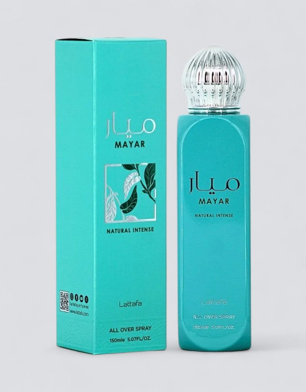 Mayar Natural Intense All Over Spray opens with the refreshing and tropical blend of fig, green tangerine, coconut water, and juicy melon, creating a vibrant and exotic introduction. The heart unfolds with the aquatic elegance of water lily, jasmine, and lotus, adding a delicate floral touch.